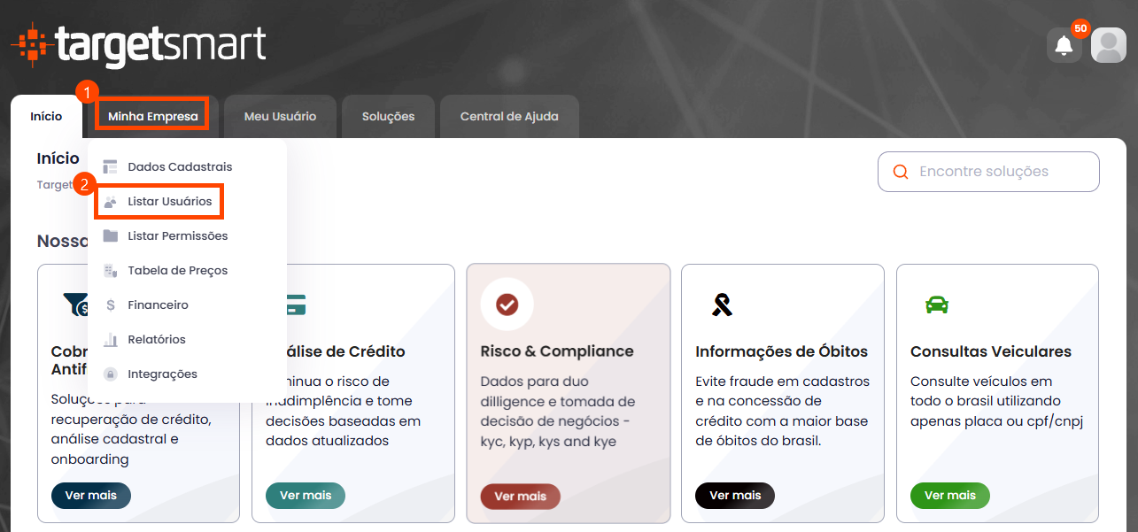 Acesse a área financeira: https://smart.targetdata.com.br/empresa/lista_usuarios/. Também pode ser acessada realizando os passos 1 e 2.