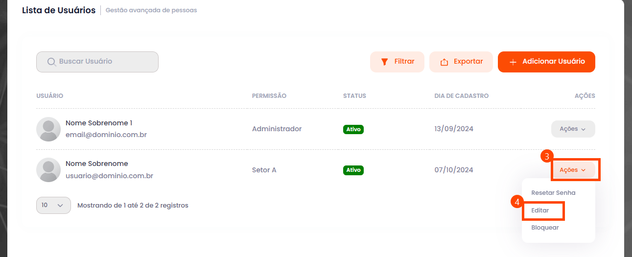 3- Localize o usuário que deseja editar e clique em "Ações"