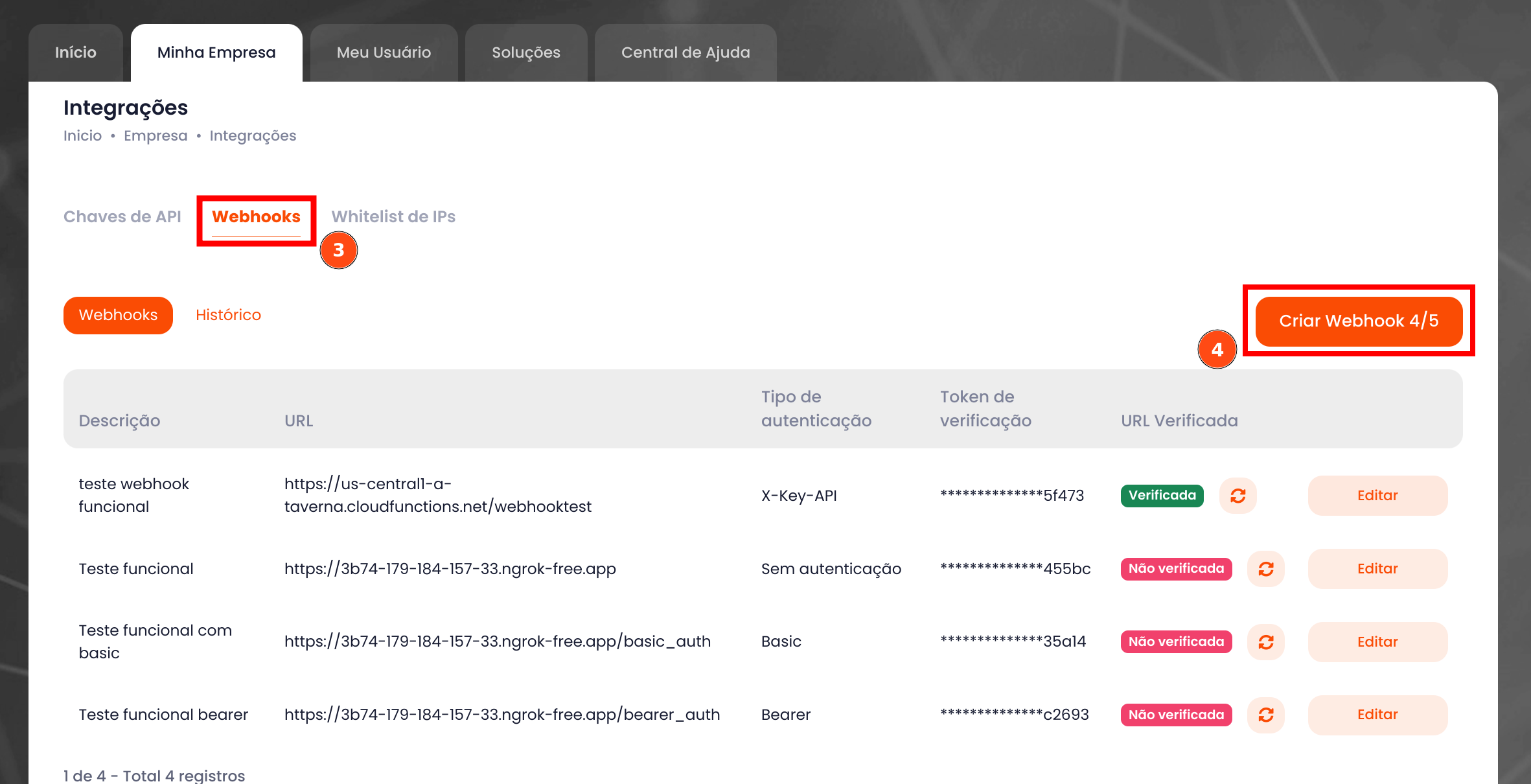 Será exibido uma lista de todos os webhooks que foram criados até o momento. (Se for a primeira vez que você estiver realizando esse procedimento, não terá nenhum item na lista). Você só poderá adicionar no máximo 5 Webhooks.