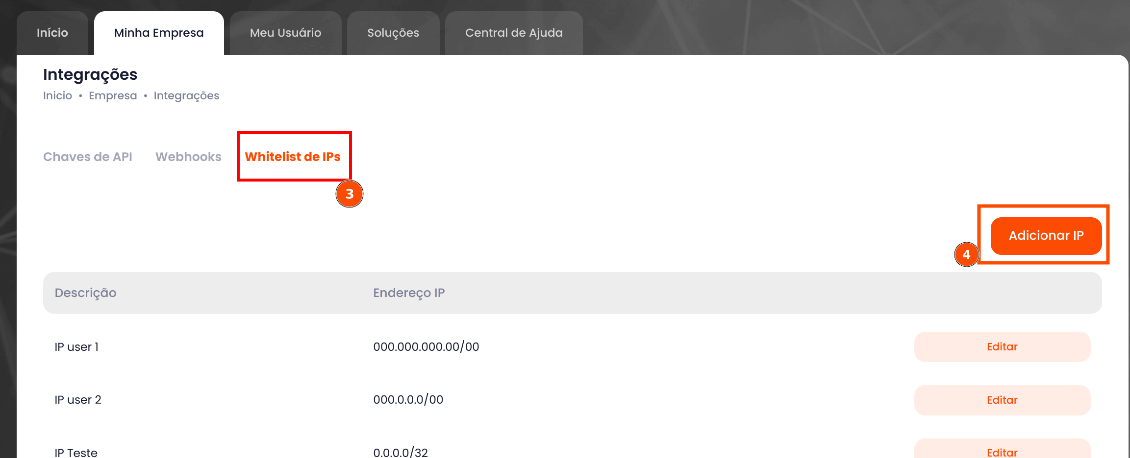 6- Se a empresa NÃO possuir IP fixo use esse IP: 0.0.0.0/32. Se a empresa tiver IP fixo digite o IP.
