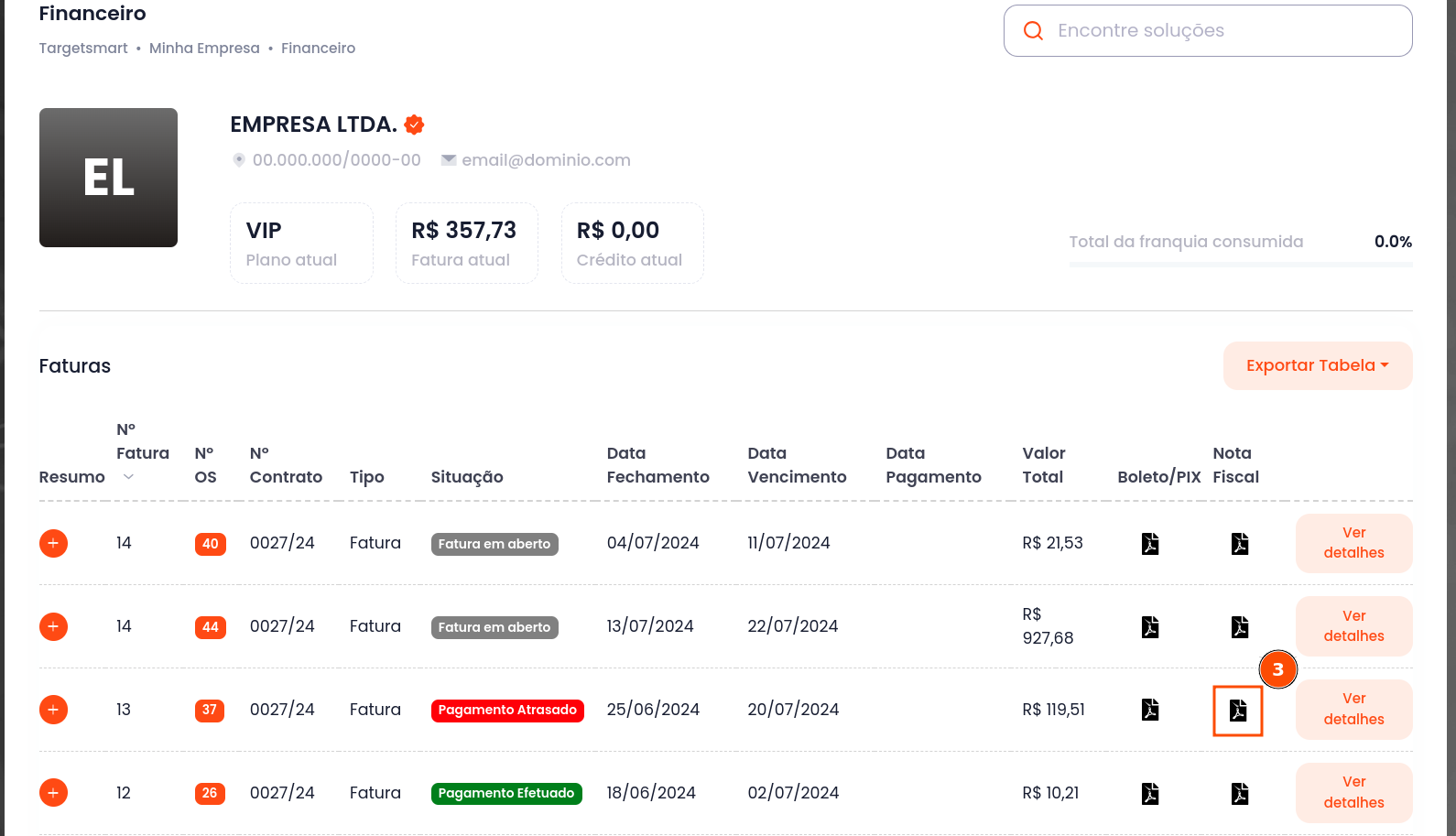 Acesse a área financeira: https://smart.targetdata.com.br/empresa/financeiro/. Também pode ser acessada realizando os passos 1 e 2.