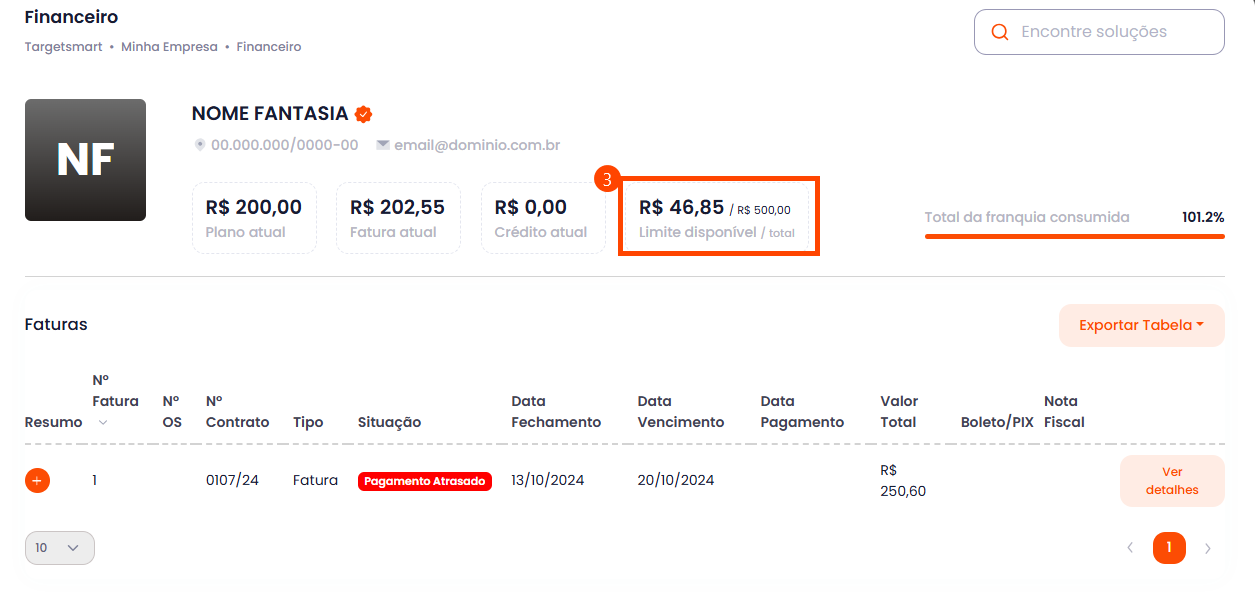 Acesse a área financeira: https://smart.targetdata.com.br/empresa/financeiro/. Também pode ser acessada realizando os passos 1 e 2.